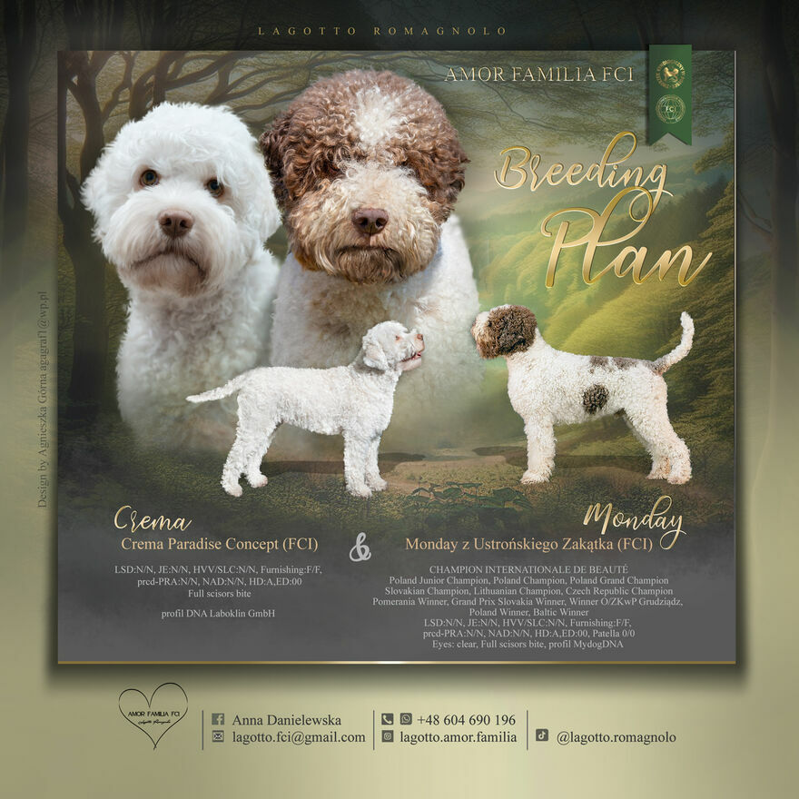 Już za kilka dni urodzą się u nas szczenięta rasy Lagotto romagnolo z obiecującego skojarzenia. Rodzicami zostaną psy rodowodowe o pięknym eksterierze, stabilnej psychice i wspaniałym temperamencie:Crema Paradaise Concept FCI & Monday z Ustrońskiego Zakątka FCI: Międzynarodowy Champion Piękności, Młodzieżowy Champion, Champion Polski, Grand Champion Polski, Champion Słowacji, Champion Litwy, Champion Cech, Zwycięzca Pomorza, Zwycięzca Polski, Zwycięzca Bałtyku , Zwycięzca Grand Prix Słowacji, Winner O/ZKwP Grudziądz, Zwycięzca Bałtyku.